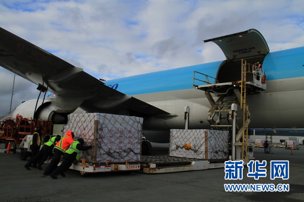 在加拿大东部新斯科舍省哈利法克斯机场,工人在往货机上装载行将飞往我国上海的龙虾。新华社记者晏忠华摄 |